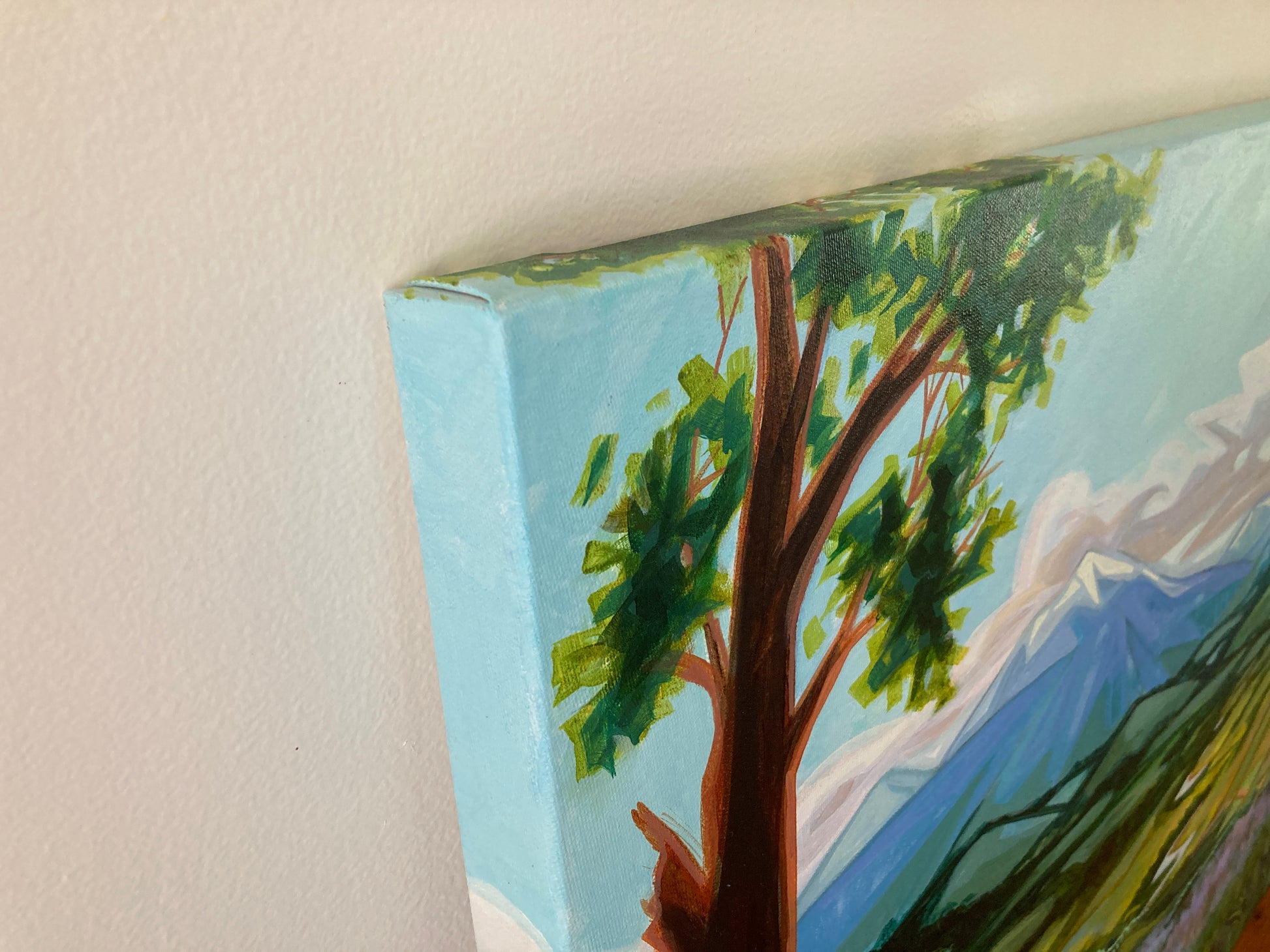 This painting is part of the "Lands Far Away" collection which remixes real places in the West Kootenay with imaginary locations from Tolkien's Middle Earth. Each painting starts with a reference photo from the West Kootenay and then is processed with Midjourney AI, using snippets of text from Tolkien's writings to push the concept further. I then paint from the resulting reference image, bringing more of my style and vision into the piece.