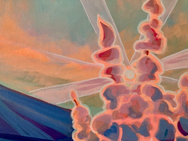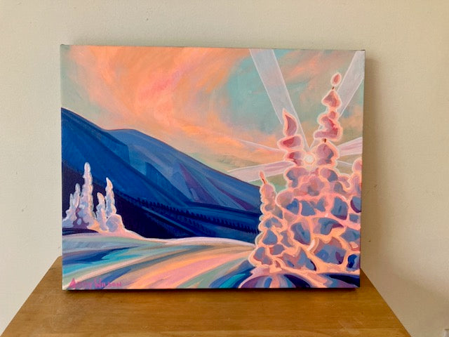 This painting is inspired by the cross-country ski trails outside of Nelson, BC. I love the first swish of snow on ski as winter deepens in the valley, and the glowing light that appears at the end of the day.