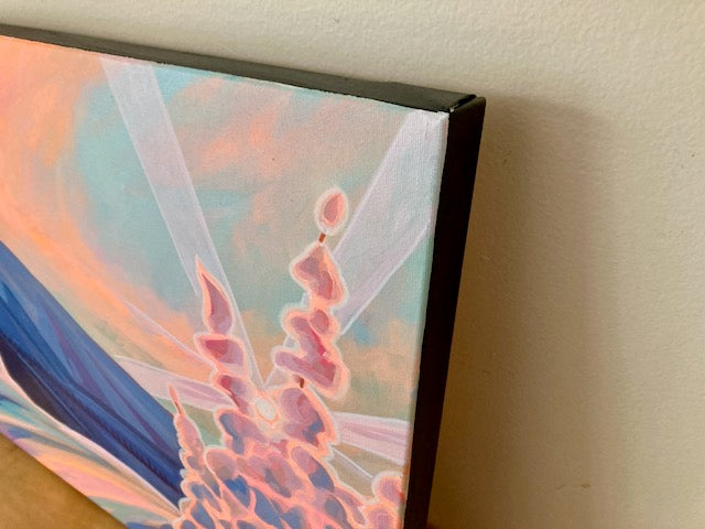 16" x 20" x 1.5" acrylic on canvas with the sides painted black and hanging hardware installed. Free shipping in North America.