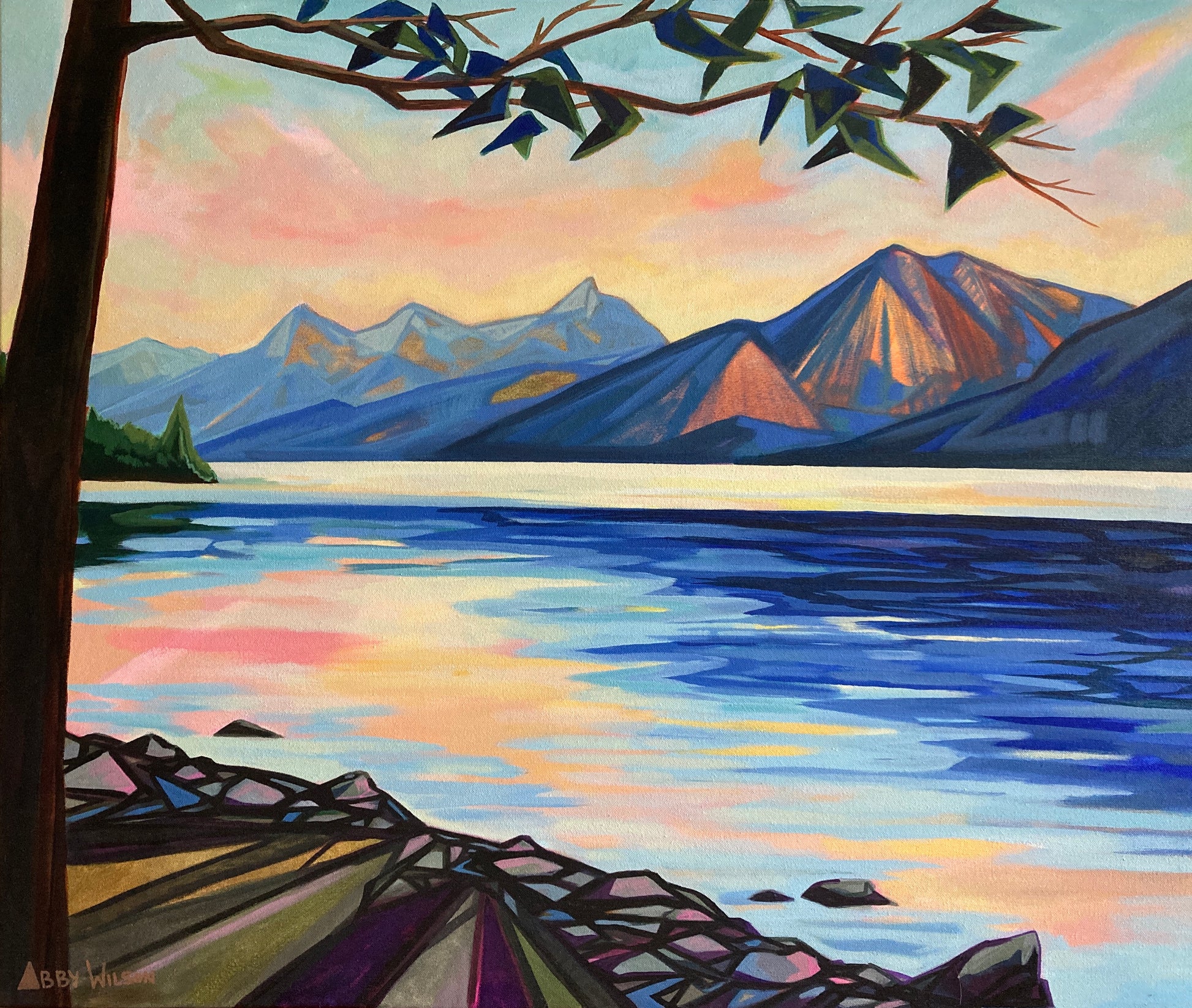 Inspired by an evening stroll along Kootenay Lake as the sun kissed the mountain peaks with golden light. This piece has soft, dreamy colours and brings a sense of calm to any space.