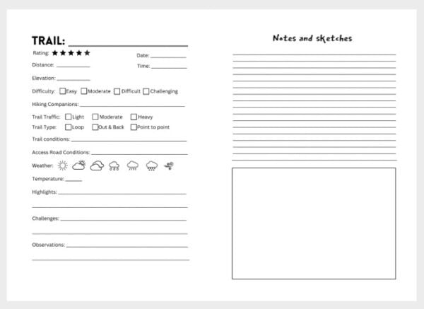 This log book helps you capture the details and memories of your hikes. Complete the fill-in pages with helpful prompts about distance, elevation, hiking companions, weather, and more. Add your own notes and sketches to make it yours!